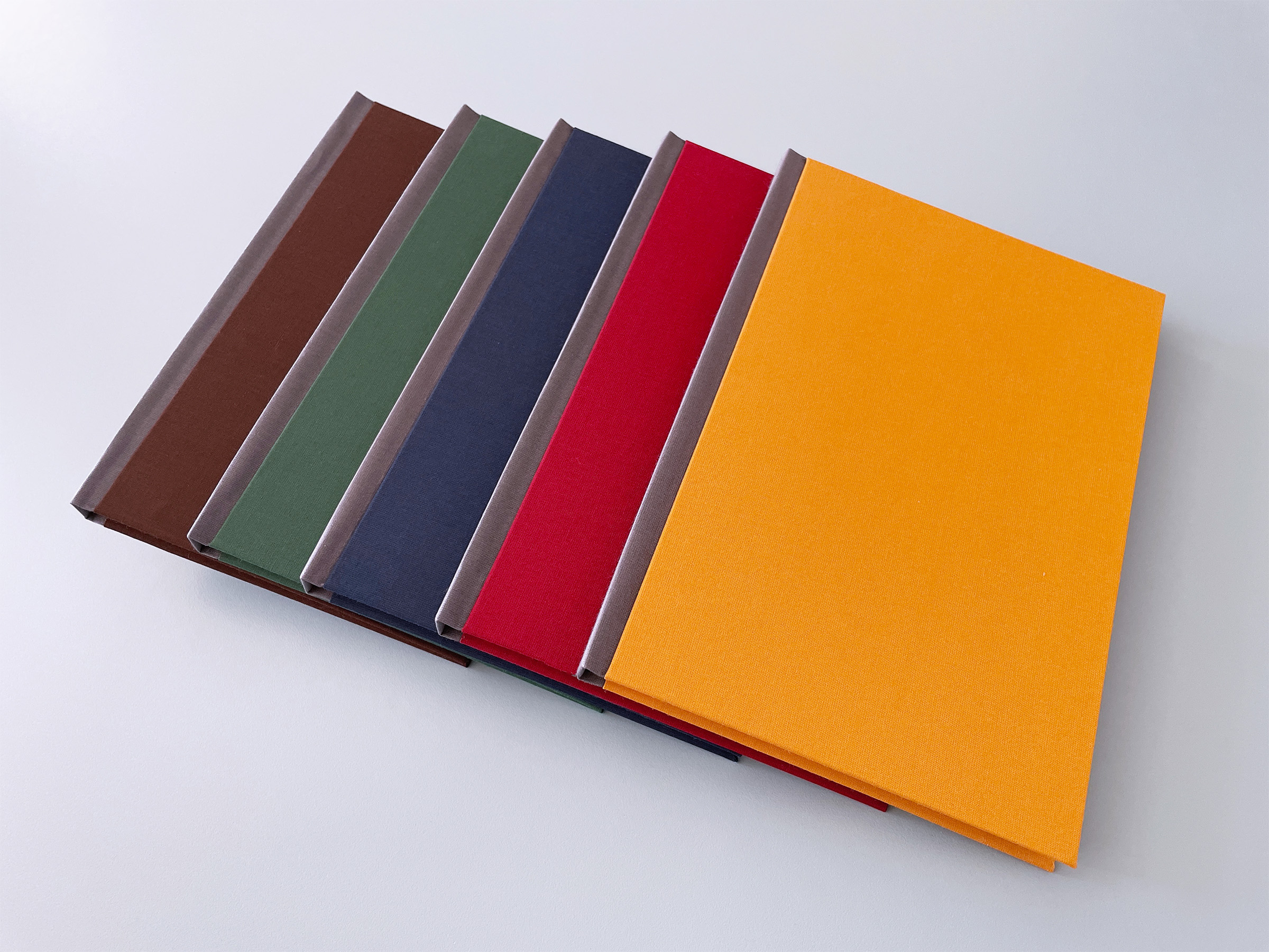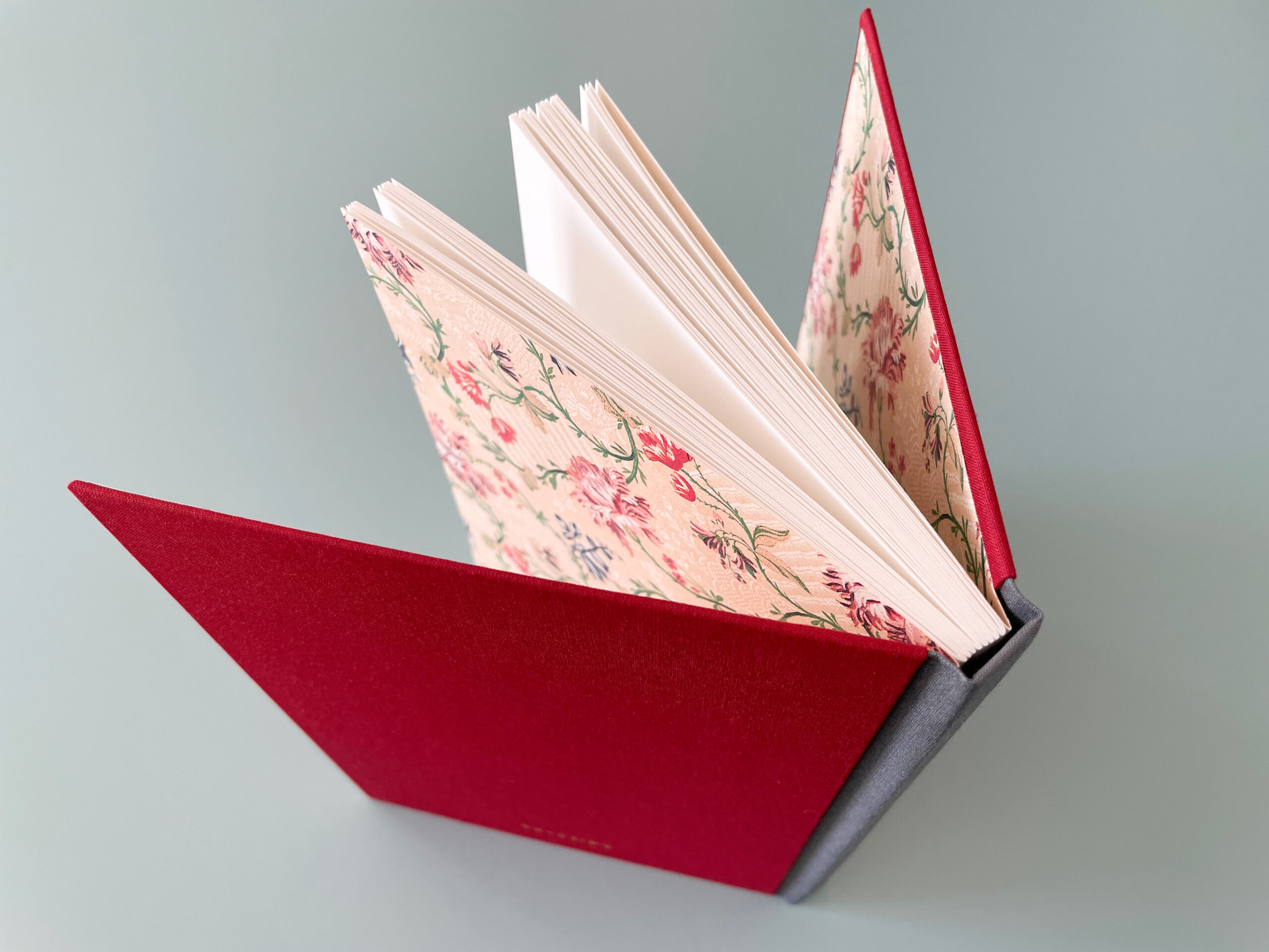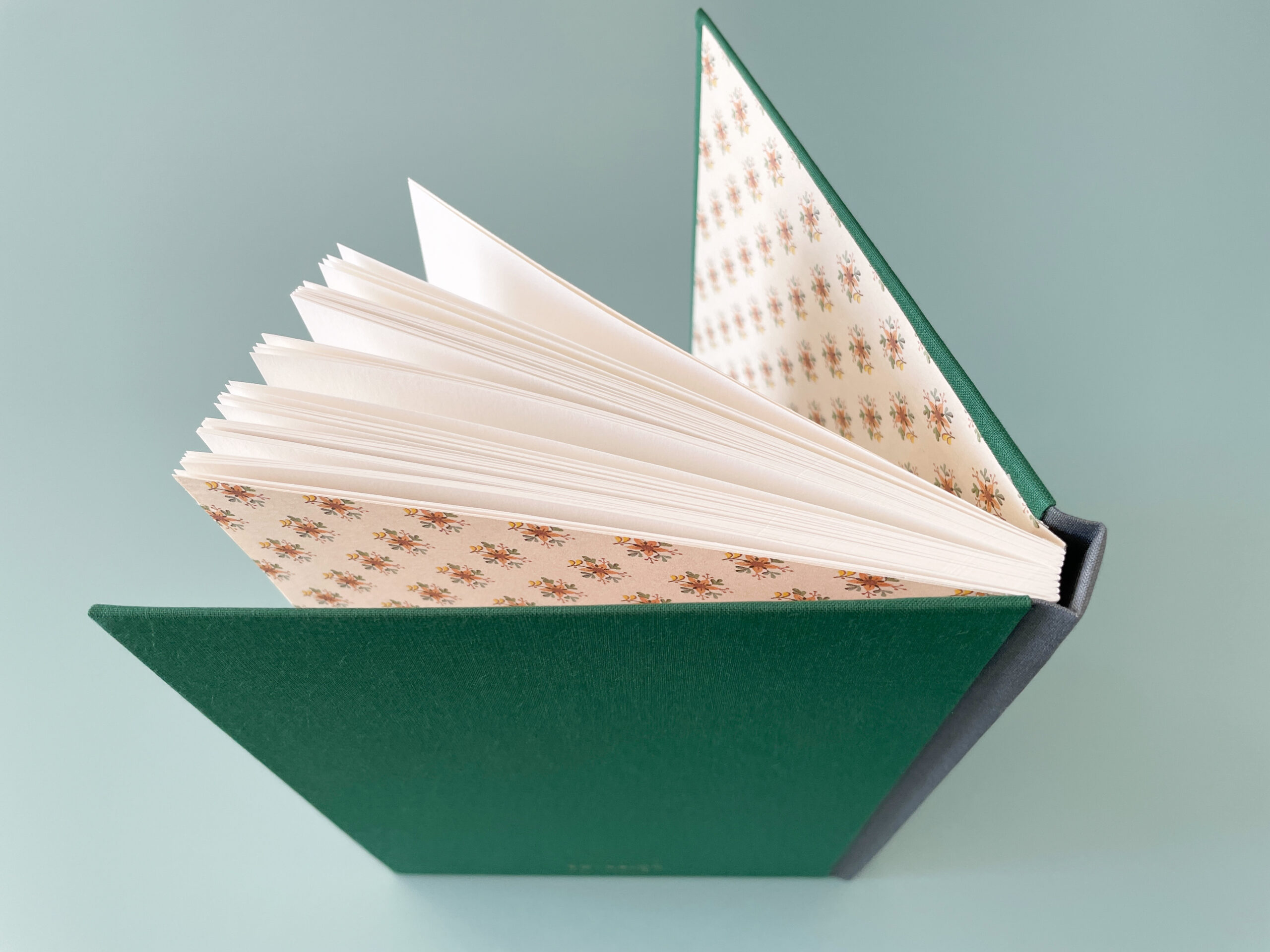 Each book is carefully sewn and cased into sturdy boards, then wrapped in richly coloured bookcloth with a contrasting grey cloth spine — the defining detail of the series. Inside, decorative endpapers inspired by 19th century French designs add a subtle note of charm and character. Available in five curated shades — blue, red, green, yellow, and brown — Fleur celebrates colour, craftsmanship, and quiet elegance: minimal in appearance, tactile in use, and made to be kept for years.